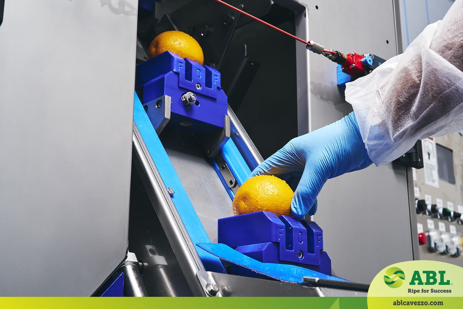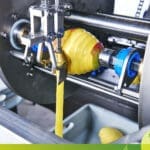 OP30 is very simple to run: a single operator is feeding the fruit into the machine on interchangeable cups which varies depending on the fruit variety. Two self -centered hand will gently transfer the fruit between two mandrels that will put them in rotation to allow to be peeled by the ABL patented peeling system. When processing citrus fruits, a coring option is also available trough simple ON/OFF button.